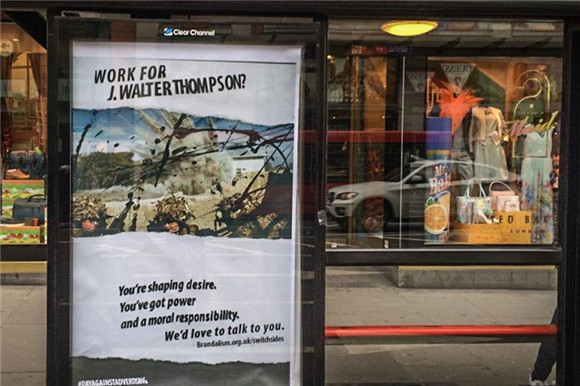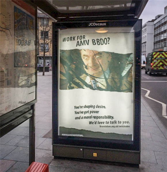 英国的Brandalism就是这样一家反广告组织。最近,他们把反广告的目标对准了大型广告公司,明目张胆得把反广告的海报贴在广告公司门口了,劝导广告人转行去做更有意义的事。