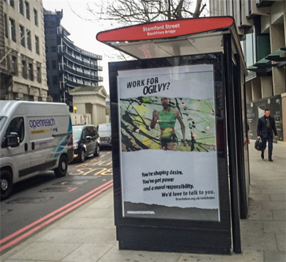 这样的广告已经被贴在伦敦Abbott Mead Vickers BBDO(天联), J Walter Thompson(智威汤逊)和 Ogilvy & Mather(奥美), 以及曼切斯特的TBWA(李岱艾),这些大型广告公司门口的公交车站广告栏上。海报中央是各家广告公司为士力架、英国军方招募士兵、碧辟等做的广告。