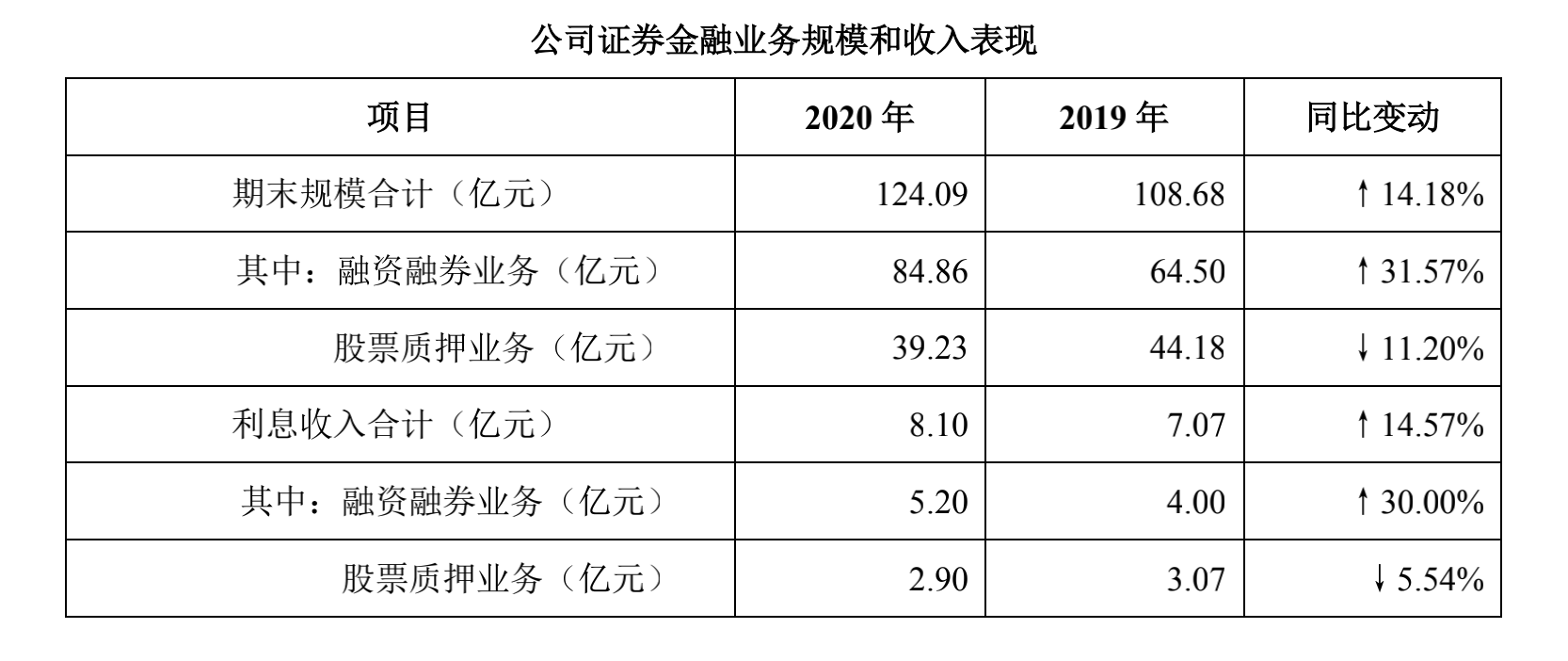 华安证券2020年实现信用业务收入8.1亿元,其中融资融券业务收入为5.2亿元,股票质押业务收入为2.9亿元。报告期内,华安证券融资融券规模为84.86亿元,同比增长31.57%,股票质押业务规模为39.23亿元,同比下降11.2%。