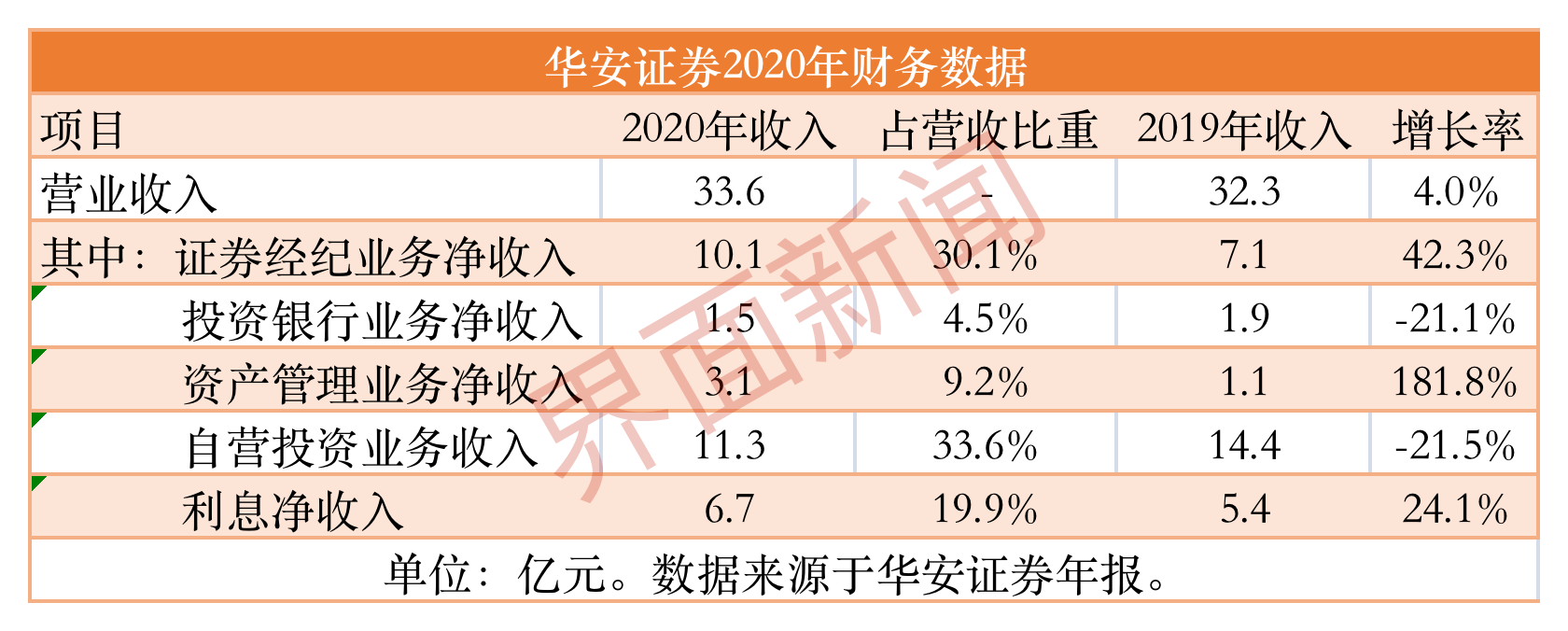 华安证券2020年营收增速显著低于行业整体水平,自营业务和投行业务出现负增长。