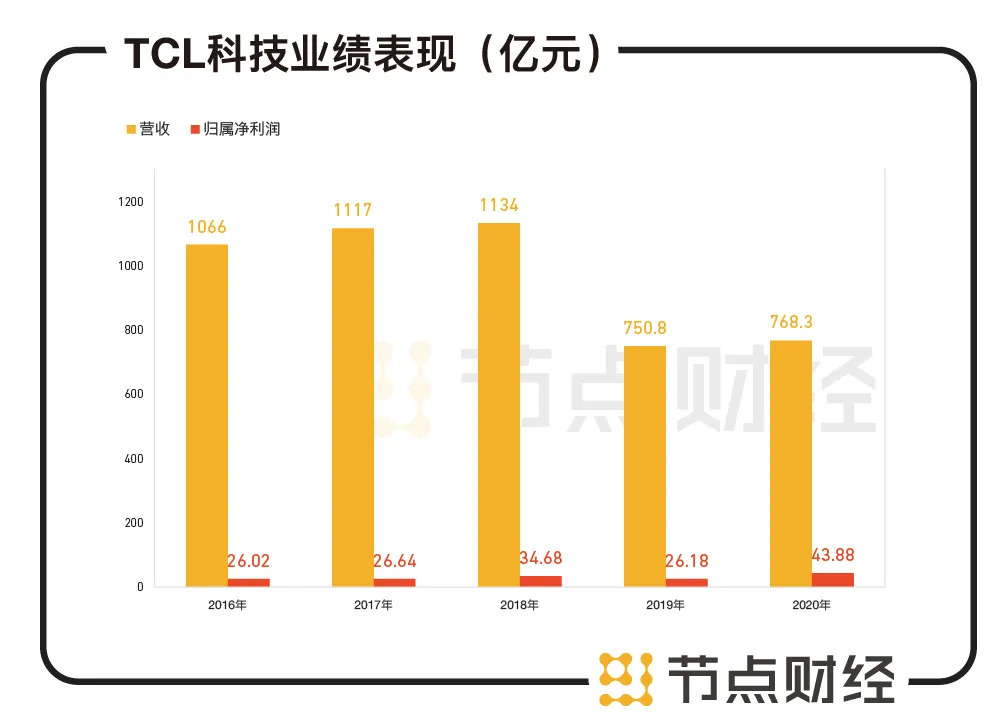 2020年,TCL科技实现营业收入768.3亿元,同比增长2.33%;对应归属于上市公司股东净利润43.88亿元,同比增长67.6%。