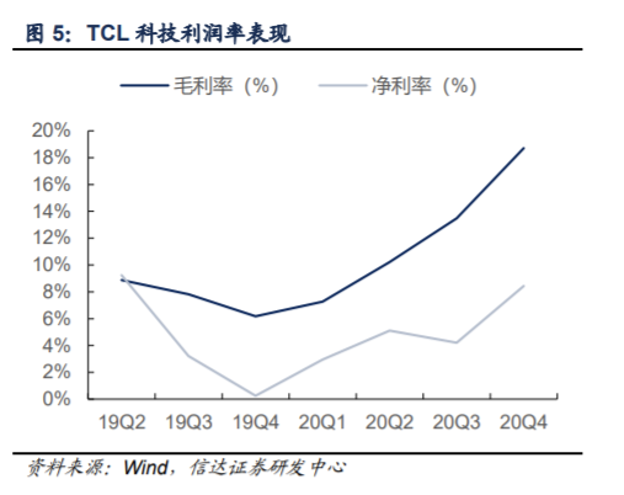 体现在TCL科技身上,2020年公司销售费用、管理费用、财务费用三项费用率合计为 7.31%,相比去年同期下降了0.68%,净利润率提升2.38个百分点至6.61%。