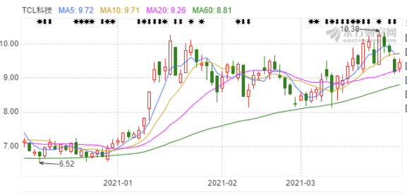 节点财经统计,2020年年初至今,TCL科技股价从4.41元/股上涨到3月22日盘中最高10.38元/股,年涨幅约135%,动态市盈率超过30倍。