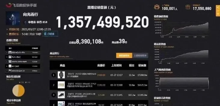 13.57亿,这是二次复出的辛巴,在近6个小时的直播时间里,用39件商品、839万的订单量,完成的销售数据。