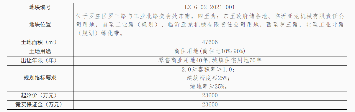 据公告显示,此次成交地块编号为LZ-G-02-2021-001号,地块位于罗庄区罗三路与工业北路交会处东南。该地块面积47606平方米,规划条件2.0≥容积率>1.0;建筑密度≤25%;绿地率≥35%。