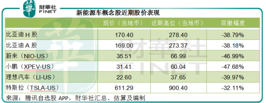从下图可见,不仅仅是比亚迪,特斯拉(TSLA-US)和中国的造车新势力蔚来(NIO-US)、理想汽车(LI-US)及小鹏(XPEV-US)在涨至近期高位之后都显著回落,其中三剑客的回调幅度最大,达到40%左右。