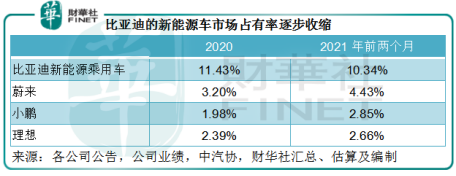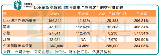 2021年前两个月,比亚迪的新能源乘用车销量同比增长2.06倍,至2.99万辆,增幅似乎相当理想。但须注意,期内全国的新能源车销量同比增长3.82倍,至28.9万辆,蔚来、小鹏和理想的前两个月新能源车交付量增幅更分别达到4.6倍、5.8倍和4.3倍。