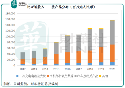 与三大造车新势力和特斯拉专注于新能源汽车不一样的是,比亚迪的汽车业务包含新能源汽车和传统燃油车。除了汽车业务之外,该公司还从事手机部件及组装业务、二次充电电池及光伏业务,近两年还拓展城市轨道交通业务。