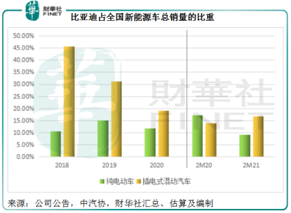 相比之下,2020年全国新能源车销量同比增长13.35%,至136.7万辆。因此,比亚迪的新能源车销量占全国新能源车销量的比重逐步下降。