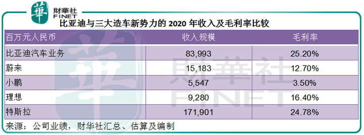 当然,比亚迪的业务还包括传统燃油车,估计这也是其利润率较占优势的原因。从下表比较可见,2020年比亚迪汽车业务毛利率达到了25.2%,高于蔚来、小鹏、理想甚至特斯拉(后四家公司的业绩按美国会计准则编制)。