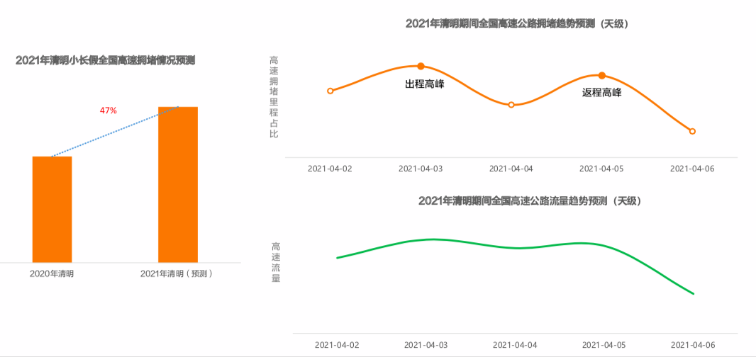 预计从2021年4月2日(清明小长假前一天)15点开始,全国高速交通压力逐渐增大。受高速免费通行以及出行需求集中的影响, 预计4月3日(清明小长假第一天)8点至12点为高速出程拥堵高峰,尤其在10点至11点达到峰值。4月5日(清明小长假最后一天)14点至19点为高速返程拥堵高峰,建议考虑错缝出行。