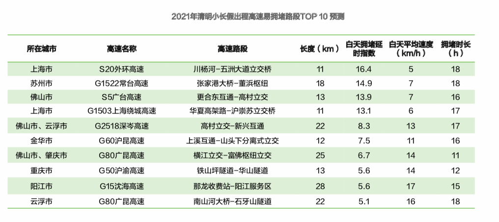 4月3日清明小长假第一天,预计全国高速出程较易拥堵的路段前三位依次是:上海S20外环高速(川杨河-五洲大道立交桥),白天拥堵延时指数是16.4, 平均速度约为5km/h;G1522常台高速苏州段(张家港大桥-董浜枢纽);S5广台高速佛山段(更合东互通-高村立交)。