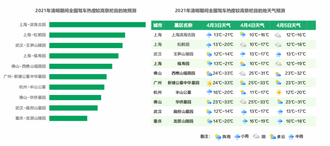 值得一提的是,在前十位驾车热度较高的祭祀目的地中,上海有三个墓园上榜,分别是滨海古园、松鹤园、福寿园。武汉的玉笋山陵园驾车热度位列第三。