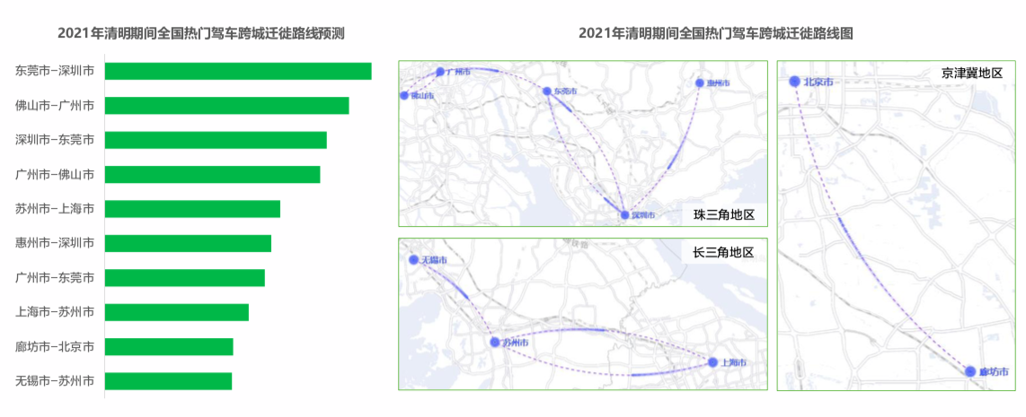 返乡探亲和旅游出行客群,构成了今年清明出行的主力。高德地图预计,清明期间全国热门驾车跨城迁徙路线有东莞市-深圳市、佛山市-广州市、深圳市-东莞市等,珠三角地区占比达六成。