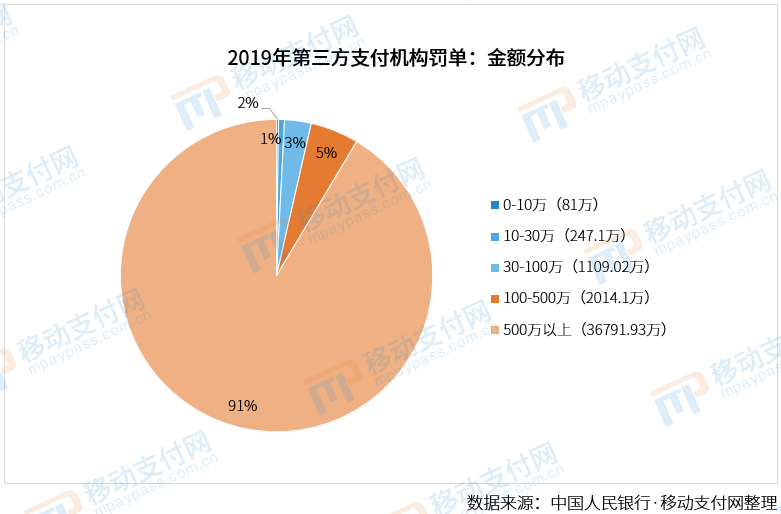 从金额来看,500万以上罚单合计36791.93万元,占总金额91.42%,分别来自12家不同的支付机构。相比之下,2019年的500万以上罚单贡献约占总罚金78%。