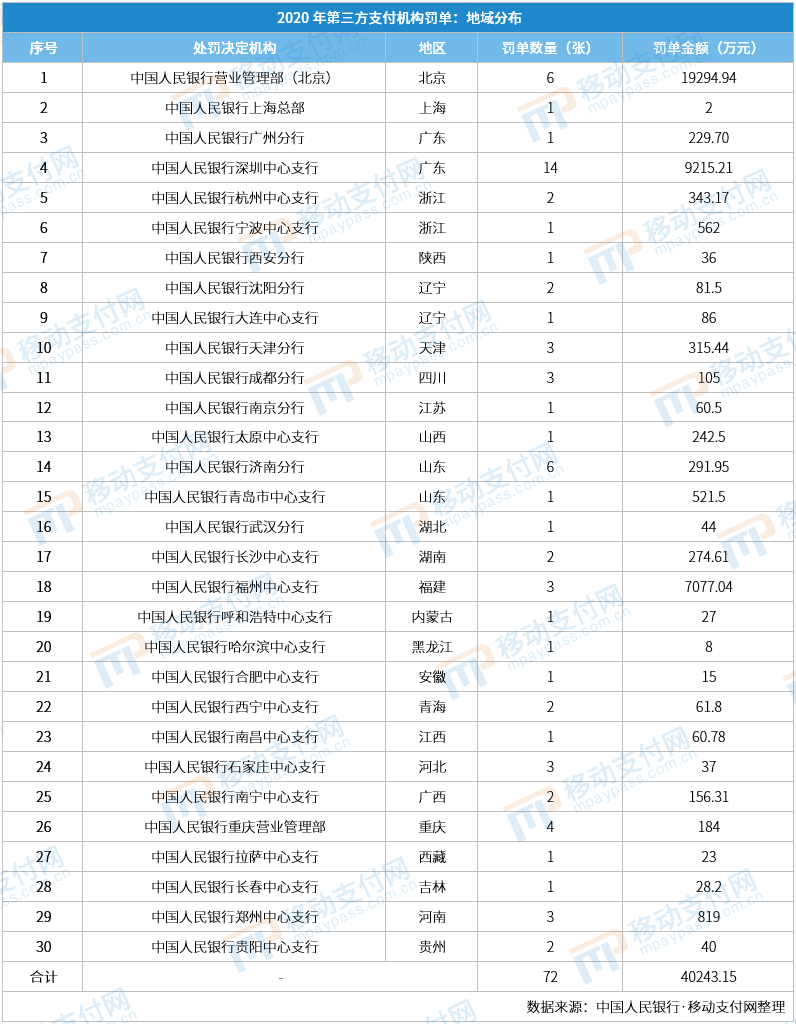 按照属地原则,2020年人民银行共30个分支机构对第三方支付机构开过罚单。