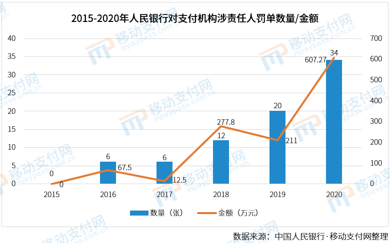 随着第三方支付“严监管”不断深入,行政处罚“双罚制”特点愈发明显。2020年72张罚单中,有34张涉及对相关责任人处罚,比例达47.2%,罚款共计607.27万元,两项数据为历年最高。而2016年-2019年,涉及对相关责任人罚单比例分别只有12%、5%、7.5%、17.4%,罚款金额分别为67.5万元、12.5万元、277.8万元、211万元。2015年两项数据,则均为零。