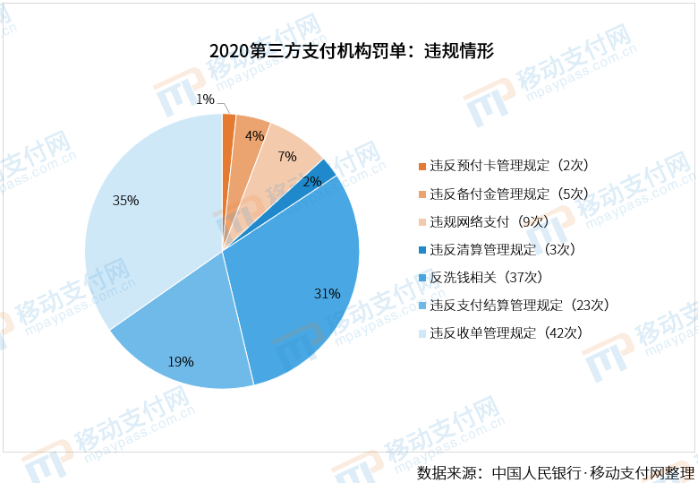2020年第三方支付机构罚单违规情形,包含了违反收单业务管理规定、违反支付结算管理规定、违反反洗钱相关规定、违反备付金管理规定、违反预付卡管理规定、违反清算管理规定等等,基本涵盖了支付机构所面临的所有合规问题。