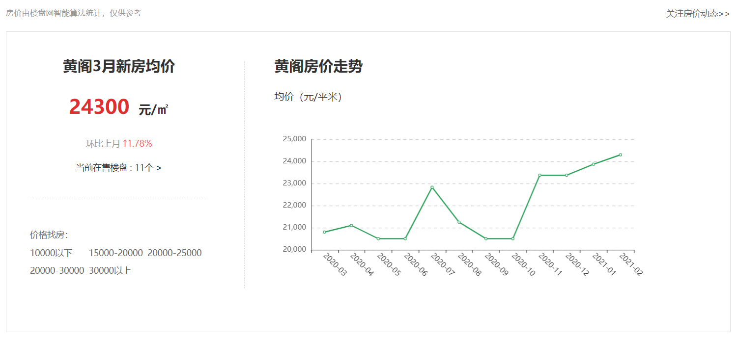 自2020年起,不少开发商就已经进驻黄阁,新楼盘如雨后春笋一般冒出,房价涨幅达18.07%。从下图看出,黄阁的房价上升非常快。