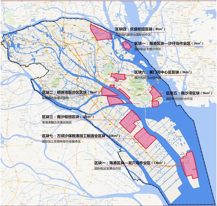 自2014年建区后,南沙片区成为广东自贸区最大的一个片区,划分为7个区块:海港区块、明珠湾起步区区块、南沙枢纽区块、庆盛枢纽区块、南沙湾区块、蕉门河中心区区块、万顷沙保税港区块。