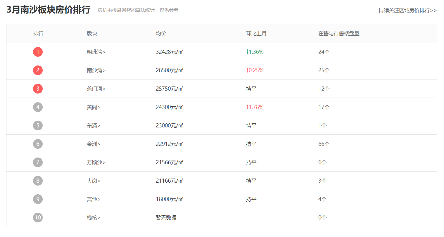 这里面,南沙核心发展区是明珠湾、南沙湾、蕉门河区块和黄阁-庆盛板块。截至今年3月,这四个板块房价也是相对最高的。