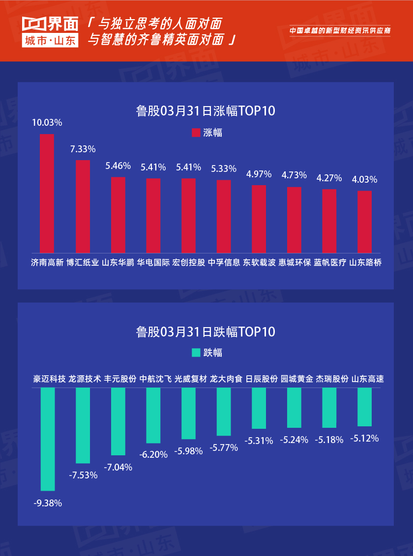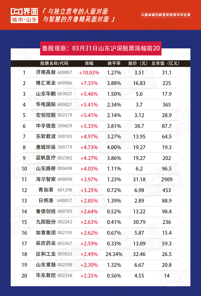 受大盘影响,3月31日,山东省内沪深股票有119只个股上涨,105只下跌,济南高新领涨。
