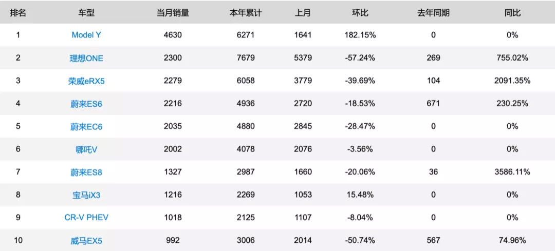 根据乘联会发布的2021年2月新能源汽车SUV销量排行榜可以看到,特斯拉Model Y位居第一,销量为4630辆;理想ONE以2300辆的销量位居第二;上汽旗下的荣威eRX5销量2279辆,排名第三;蔚来ES6与EC6分别占据第四、第五名。