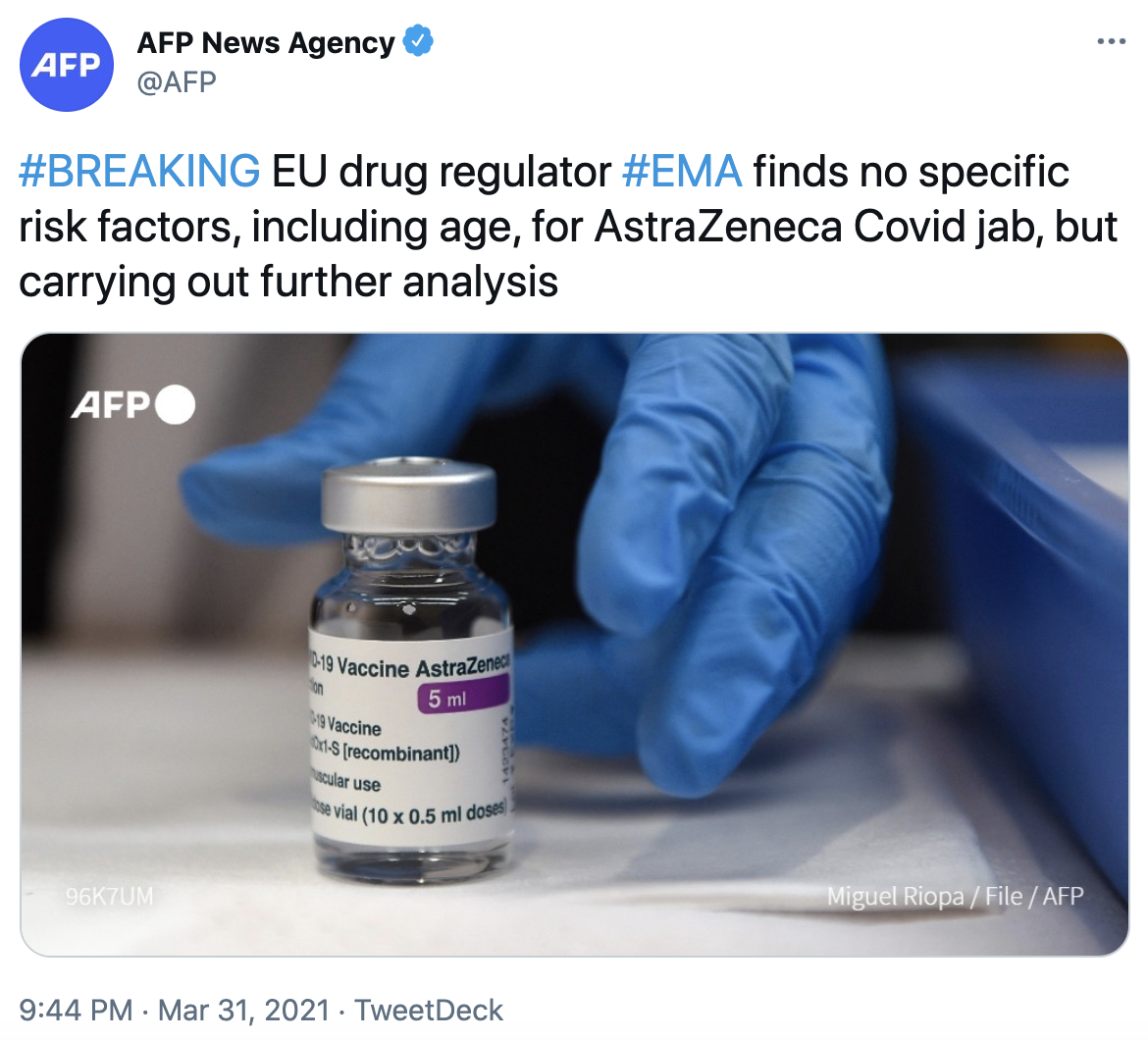 法新社3月31日消息,欧洲药品管理局(EMA)未发现接种阿斯利康新冠疫苗存在包括年龄在内的特定风险因素,但正在开展进一步分析。