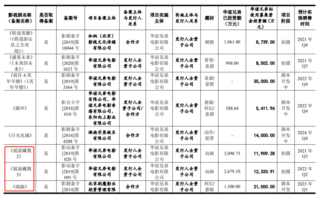 其中,两部《摇滚藏獒》分别预计2021年第三季度与2022年第二季度上映;《端脑》预计2023年第一季度上映。作品均已取得备案,两部《摇滚藏獒》目前正处于拍摄阶段,《端脑》正处于剧本开发阶段。