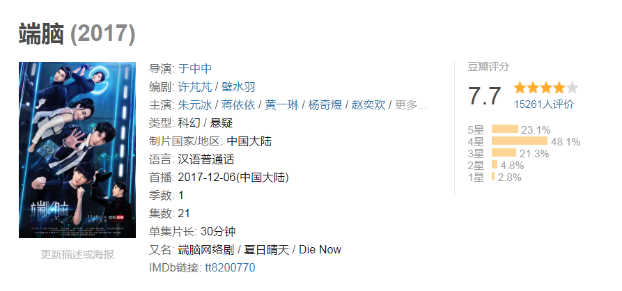 不过,随着近年来对科幻作品关注度的提高,《端脑》真人电影未来或许仍有想象空间。2019年春节档,《流浪地球》电影的票房成功让国产科幻电影走进人们的视野。当年年度票房前10的电影中有3部为科幻片,科幻电影在中国市场的累计票房达到195.11亿。