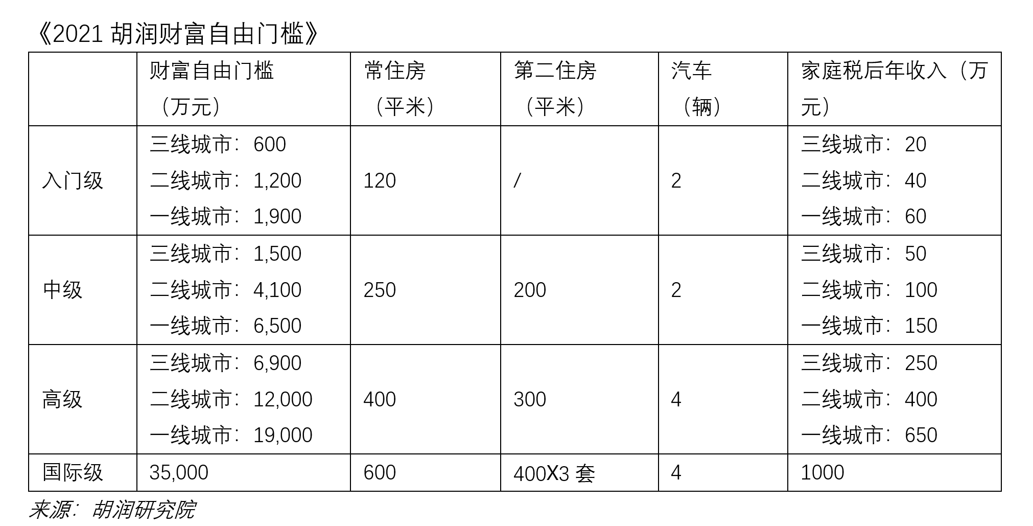 3月31日,胡润研究院发布《2021胡润财富自由门槛》(Hurun Financial Freedom in China 2021),披露了财富自由的不同门槛:中国一线城市入门级财富自由门槛1900万元,二线城市1200万元,三线城市600万元;一线城市中级财富自由门槛6500万元,二线城市4100万元,三线城市1500万元;一线城市高级财富自由门槛1.9亿元,二线城市1.2亿元,三线城市6900万元;国际级财富自由门槛3.5亿元人民币,相当于5000万美金。