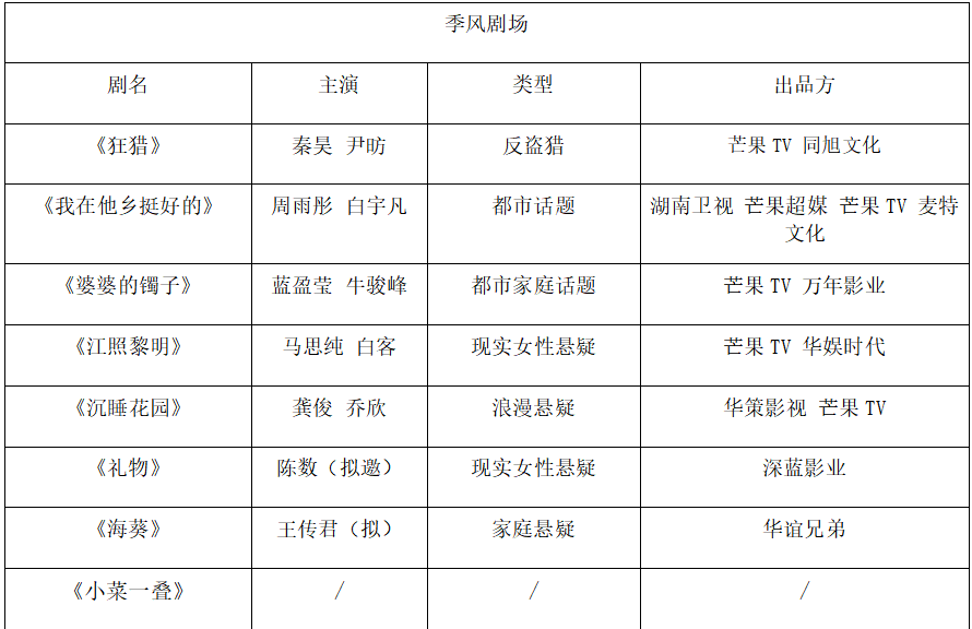 不过,“季风剧场”目前只有首部作品《狂猎》已经进入待播阶段,《我在他乡挺好的》《婆婆的镯子》仍在拍摄,《江照黎明》《沉睡花园》预计4月开机。再结合《理智派生活》上线“青春进行时剧场”,“季风剧场”很可能要等到Q2季度中后段才能正式开张。