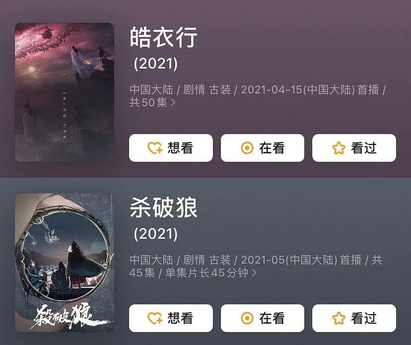 豆瓣信息显示,企鹅影视、獭獭文化联合出品的《皓衣行》4月15日首播,企鹅影视与慈文传媒、懿德文化、微颗影业出品的《杀破狼》5月首播,而这两部剧皆为“耽改101”的种子选手。