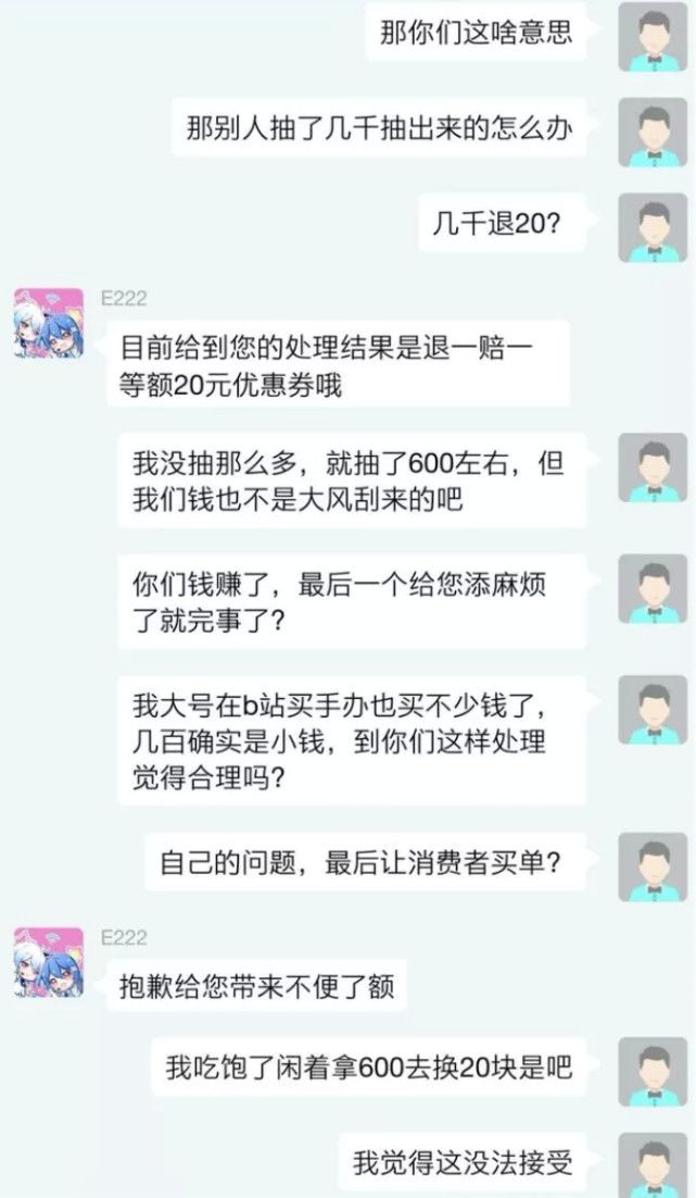 “我以为最后怎么也会抽到一个”,在小熊魔力赏视频下方的评论区中,一位网友留言,而另一位网友则表示,“朋友,这就是真实概率,我抽了五万多都没出手办,立牌跟抱枕抽到几十个,我怀疑那几个抽到的是托来的,工商投诉都投诉过了,反馈给我的消息是说他们这个魔力赏不是抽奖,说我这属于购买,所以不予处理,最后基本全退了亏了一万左右的差价,够我买七八个了。”