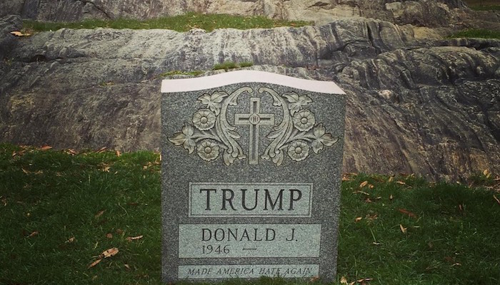 墓碑上面刻有特朗普的名字,底下还有一行墓志铭:“让美国再次充满仇恨”(Make America Hate Again),显然针对的是特朗普的竞选口号“让美国再次伟大起来”(Make America Great Again)。