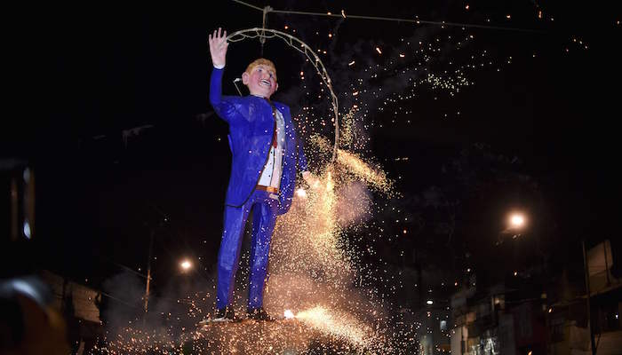 被特朗普点燃的怒火甚至烧到了国外。《每日邮报》称,墨西哥人今年的复活节一项传统焚烧恶灵的活动出现了变化,转而焚烧特朗普的肖像。周六晚间,在穷困的拉麦塞德(La Merced)社区,数百民众聚集在一起,一边看着微笑的特朗普人偶被大火吞灭,一边兴奋高喊“去死”及各种辱骂字眼。报道称,从普埃布拉(Puebla)到蒙特雷(Monterrey),这项活动遍及墨西哥全境。