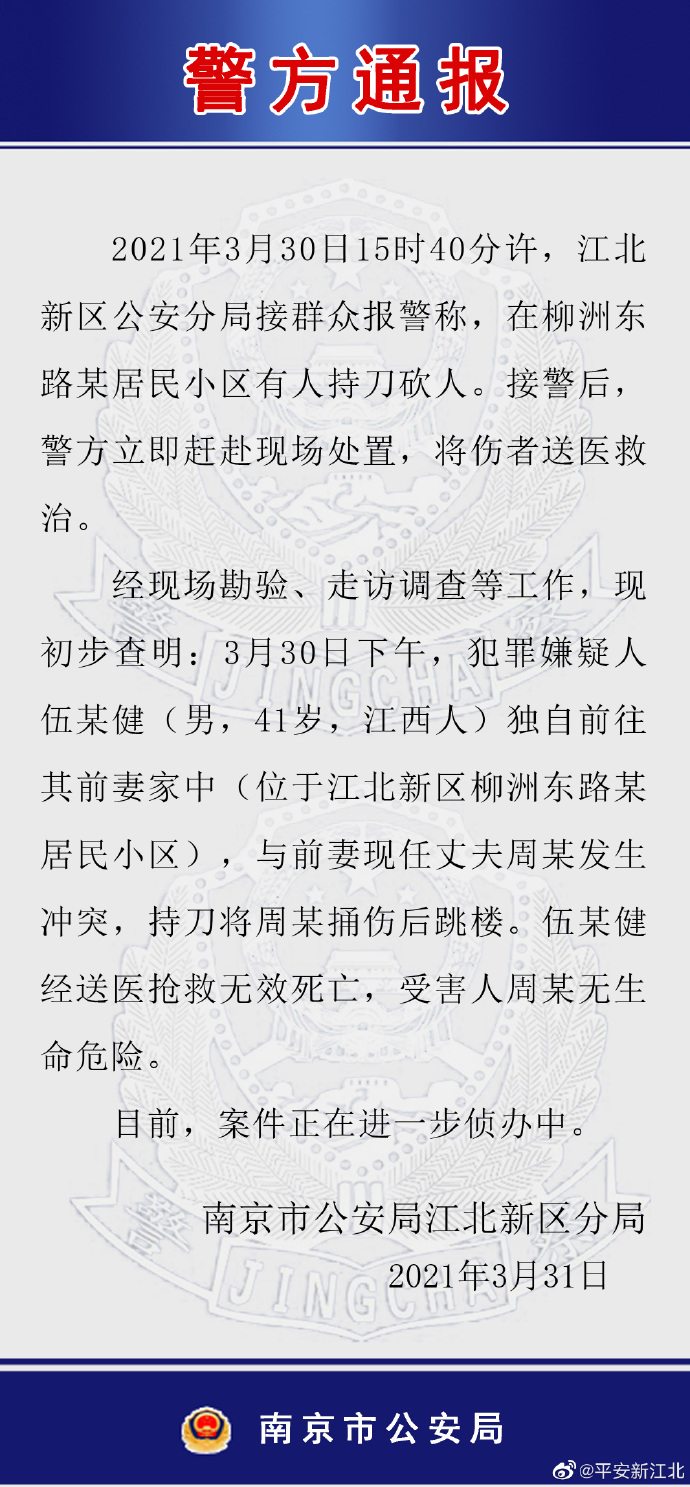 据@平安新江北 3月31日消息,3月30日15时40分许,南京江北新区公安分局接群众报警称,在柳洲东路某居民小区有人持刀砍人。接警后,警方立即赶赴现场处置,将伤者送医救治。经现场勘验、走访调查等工作,现初步查明:3月30日下午,犯罪嫌疑人伍某健(男,41岁,江西人)独自前往其前妻家中(位于江北新区柳洲东路某居民小区),与前妻现任丈夫周某发生冲突,持刀将周某捅伤后跳楼。伍某健经送医抢救无效死亡,受害人周某无生命危险。目前,案件正在进一步侦办中。