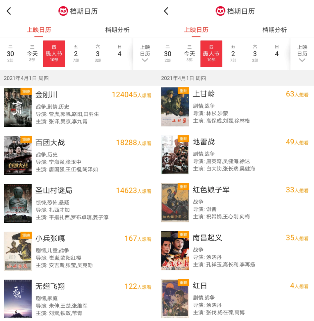 近两日,原定于4月3日上映的喜剧片《来都来了》、动画电影《恐龙飞车》提前撤档,不再参与清明档的竞争。而剧情片《小秦归乡记》和悬疑片《神探伍士德》则在后期“空降”,加入清明档。另外,截至3月31日,清明档内重映影片已经多达近10部,其中多为《金刚川》《百团大战》等主旋律影片,这无疑进一步加剧了清明档的“拥堵”。受此影响,频频变动的档期环境,也在一定程度上增加了今年清明档的不确定性。