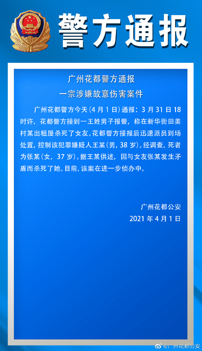 据@广州花都公安 4月1日通报,3月31日18时许,花都警方接到一王姓男子报警,称在新华街田美村某出租屋杀死了女友。花都警方接报后迅速派员到场处置,控制该犯罪嫌疑人王某(男,38岁)。经调查,死者为张某(女,37岁)。据王某供述,因与女友张某发生矛盾而杀死了她。目前,该案在进一步侦办中。