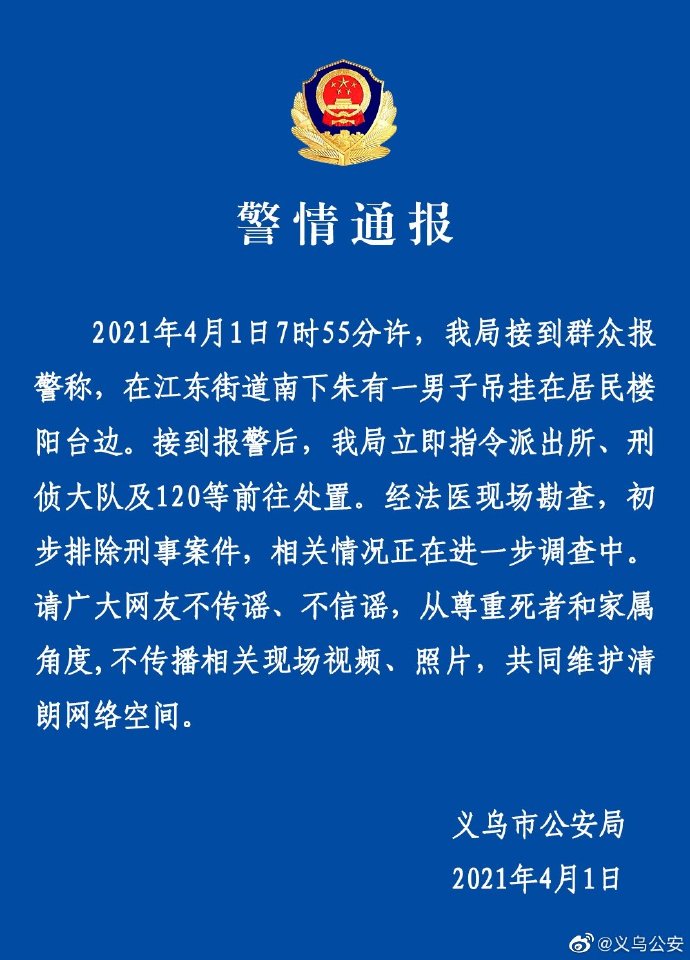 据@义乌公安 微博通报,4月1日7时55分许,浙江省义乌市公安局接到群众报警称,在江东街道南下朱有一男子吊挂在居民楼阳台边。接到报警后,公安局立即指令派出所、刑侦大队及120等前往处置。经法医现场勘查,初步排除刑事案件,相关情况正在进一步调查中。