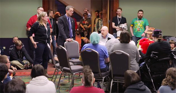 除了AFK房间之外,Take This还对参加游戏大会的员工和志愿者进行了危机培训。比如说,如果有个参会者在队伍中引起了混乱,那她也许并不是闹事的,可能是恐慌症发作,或者是高度抑郁症患者。她需要的是帮助,而不是惩罚。