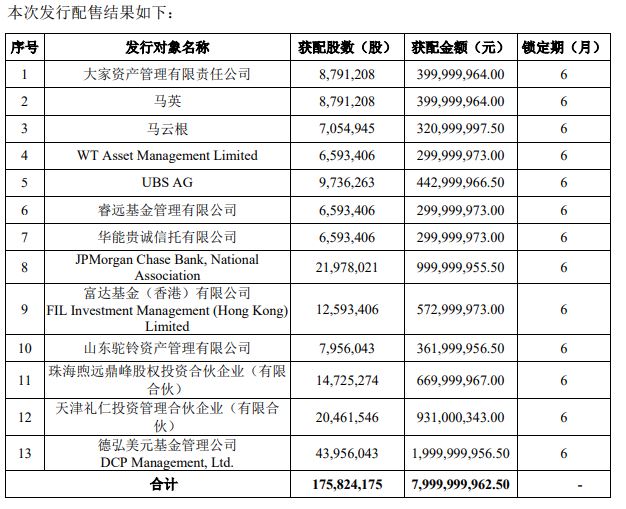 东方雨虹公告,公司发布定增报告书,确定本次发行价格为45.50元/股,发行股数为1.76亿股,募集资金总额为79.99亿元。本次发行对象最终确定为13家,其中睿远基金出资3亿元,认购659万股,大家资产管理公司出资4亿元,认购879万股等。