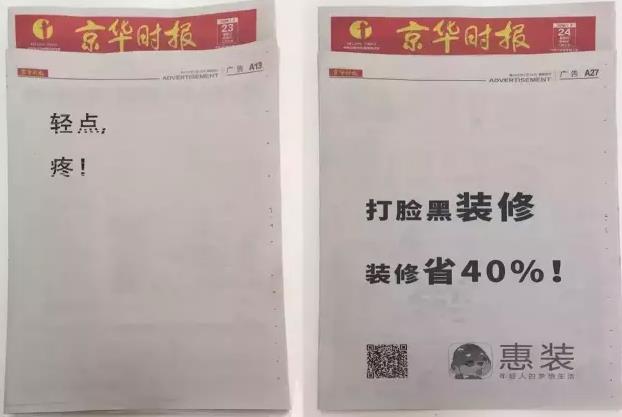 范冰冰说:成名是要付出代价的!“轻点,疼”因“疫苗事件”巧合而红,也因此其话题被禁,同时众多“别有用心人士“人士从中搅浑水,故意引导,给京华时报和惠装带来了很大的”压力“,本来定好的后续广告,不得不紧急修改,临印前10分钟才定稿,最后出街的就是大家看到的,没有了“轻点,疼”三个字的后续“打脸黑装修“内容!