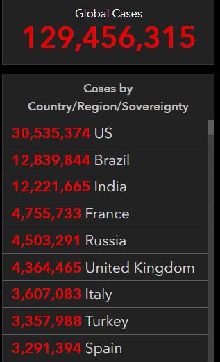 据约翰斯·霍普金斯大学的疫情追踪数据,截至北京时间4月2日上午8点,全球累计确诊新冠肺炎病例129456315例,累计死亡2825805例。