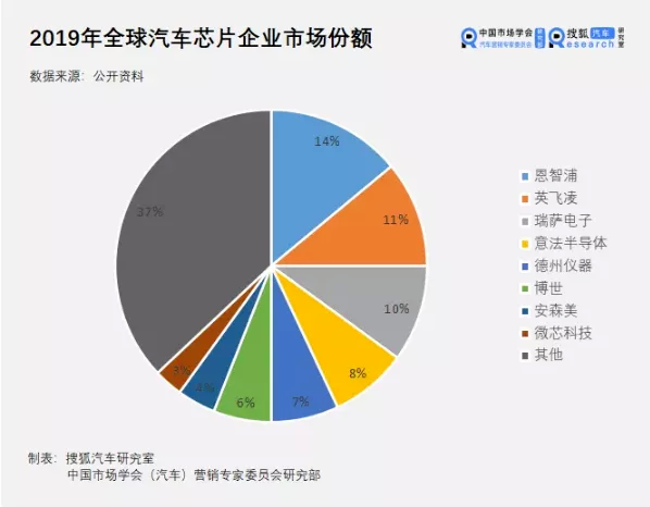 有数据显示,企业在新能源汽车领域对芯片的采购将超燃油车一倍,其中仅功率器件数量增长就超过100%。按照搜狐汽车研究室数据表明,2019年中全球汽车芯片市场份额63%掌握在欧美企业手中。