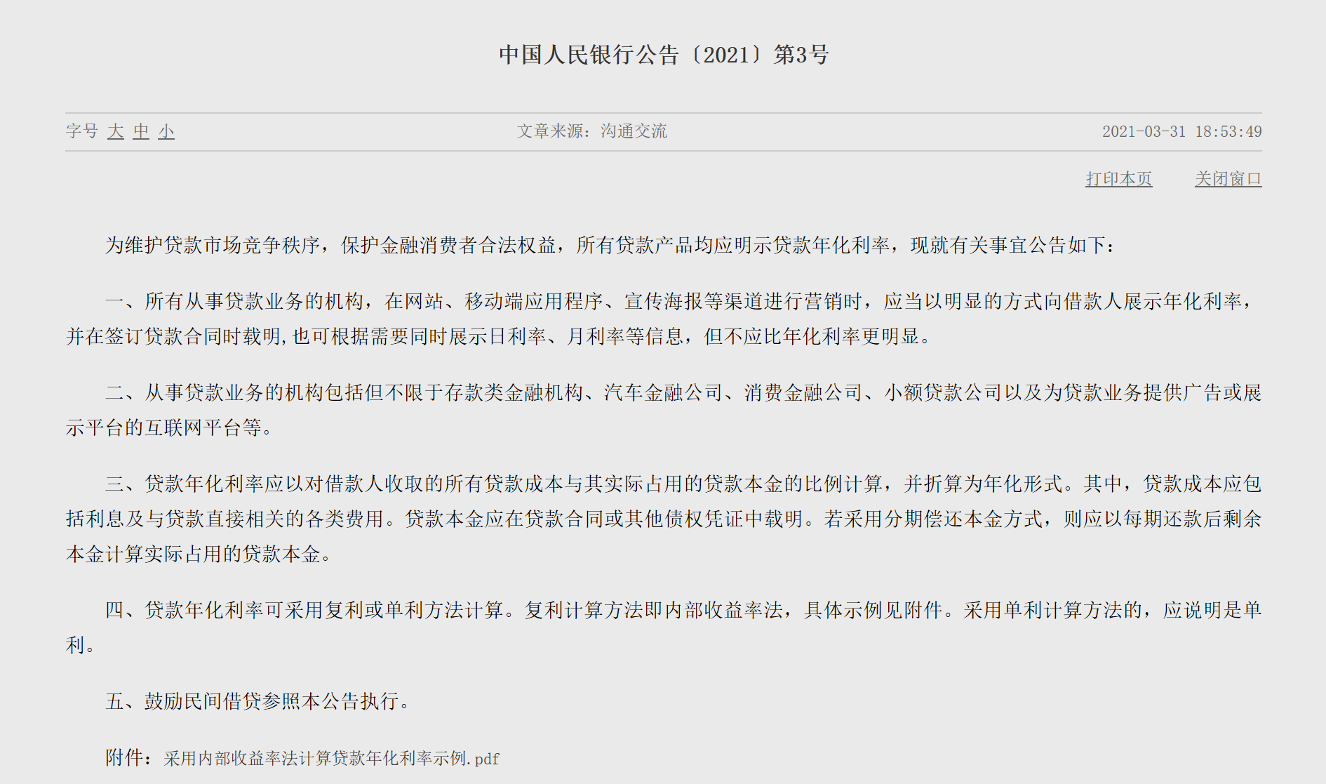 2021年3月31日,中国人民银行发布公告要求所有贷款产品均应明示贷款年化利率,以此进一步维护贷款市场竞争秩序,保护金融消费者合法权益。