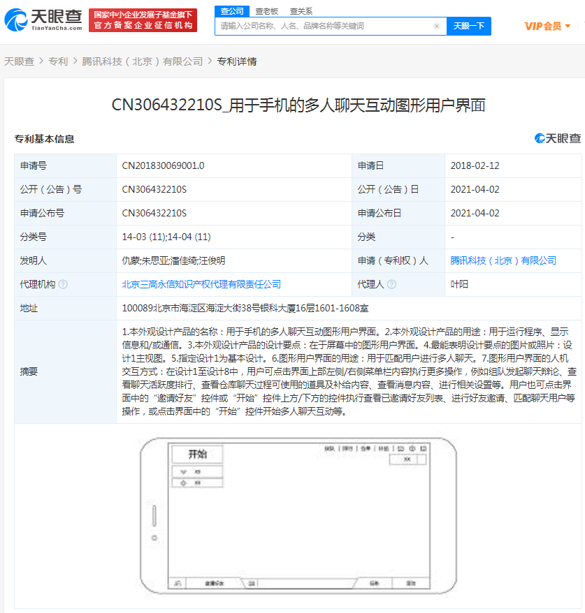 据天眼查APP显示,4月2日,腾讯科技(北京)有限公司获得一项“用于手机的多人聊天互动图形用户界面”的外观专利授权,公开号为CN306432210S,申请日为2018年2月12日。