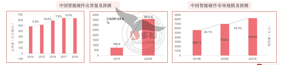 智能硬件行业从 2014 年开始进入了发展正轨。根据赛迪研究院的数据,2014 - 2018 年全球智能硬件终端产品出货量从 19.9 亿部(台)增至 32.5 亿部(台),平均年增长率超过 8%。预计到 2025 年,全球智能硬件终端产品出货量将进一步扩大到 90.58 亿部,年均复合增长率将达到13.5%。从全球市场结构来看,2019 年智能硬件中出货量前三的品类分别为:智能移动通信设备( 17.7 亿部), 智能可穿戴设备( 2.3 亿部),智能车载设备( 1.2 亿台)。预计到 2025 年,按终端产品出货量统计,全球智能硬件排前三品类分别为: 智能移动通信设备(占比 48% )、智能健康医疗设备(19%)和 智能家居设备(17%)。其中年复合增速排名前三的品类分别为: 智能机器人(35.0%)、 工业级智能硬件设备(27.9%)和智能健康医疗设备(15.7%)。