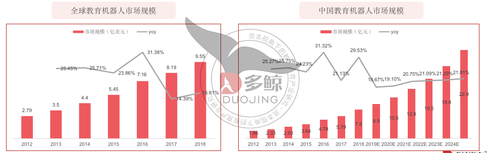 中国教育机器人市场约占全球市场的 10%-12%,增长率略高于全球市场。截止到 2018 年,中国教育机器人市场规模为 7.5 亿元,同比增长 29.53%。根据前瞻产业研究院测算,从 2020 年到 2014 年,同比增长率将保持在 20% 左右,预计至 2024 年中国教育机器人市场规模将达到 22.9 亿元。