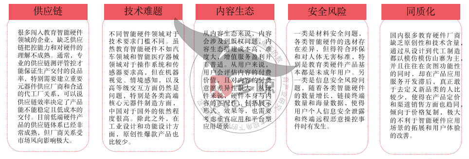 而事实上,目前的市场上的很多教育硬件产品远没有达到智能水平。在应用场景的可适性和用户体验方面远远没有达到教育消费者的需求。教育智能硬件的产业化发展,在商业模式和供应链方面也存在的各自的问题。我们认为智能硬件目前至少存在五个方面的困境,需要行业一一突破。